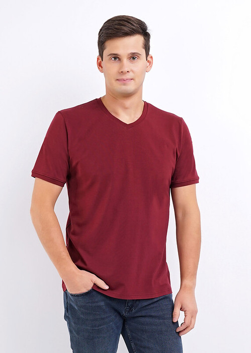 Базовая однотонная футболка стандартного объема с V вырезом горловины, втачным рукавом из хлопкового полотна с добавлением эластана. Является неотъемлемой частью мужского гардероба.