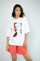Джемпер оверсайз из хлопкового трикотажного полотна. Короткий спущенный рукав. Круглый вырез горловины обработан рибаной. По переду принт вспенкой.