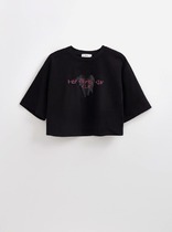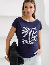 Джемпер из хлопкового трикотажного полотна. Короткий втачной рукав. Круглый вырез горловины обработан кашкорсе.  По спинке отрезная кокетка с вертикальным вырезом внахлест и кожаная нашивка. По переду принт.