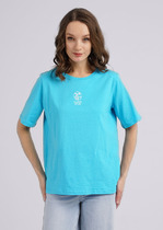 Футболка для дома из хлопкового трикотажного полотна прямого силуэта. Короткий втачной рукав. Округлая горловина с обтачкой. Спереди принт, нашивка.