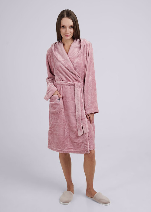 Женский халат из фактурного велсофта на запах с поясом и капюшоном, рукав полной длины, на переде накладной карман с вышивкой.