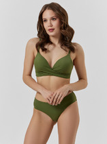 Раздельный, женский купальник в монохромную набивку. Лиф выполнен в виде треугольной, формованной чашки, с завязками на шее и спине. Плавки бикини комфортной посадки. Завершают дизайн металлические нашивки на лифе и плавках.