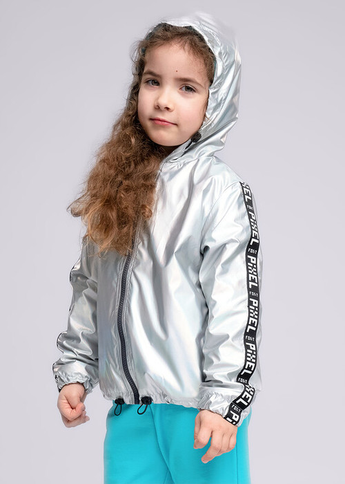 Легкая куртка из блестящей болони на хлопковом подкладе. Карманы в боковом шве. Капюшон и низ изделия на резинке с регулировкой. Украшена тесьмой с тейпом по рукавам.