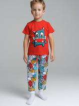 Новогодняя хлопковая пижама для мальчика, состоящая из футболки и брюк. Футболка свободного кроя дополнена оригинальным принтом спереди. Брюки умеренного объёма с эластичным удобным поясом, выполнены из хлопкового полотна в стильную клетку.