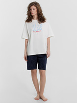 Комплект из футболки и брюк. Футболка из однотонного трикотажа, прямого силуэта с втачным рукавом, на переде принт. Брюки из набивного трикотажа с боковыми карманами с отреным бочком, по низу брюк манжеты на резинках, пояс на резинке со шнуром.