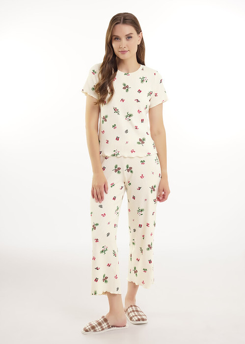 Пижама из трикотажного полотна кашкорсе с эластаном. Футболка прямого кроя, короткий втачной рукав, округлая горловина с обтачкой. Брюки прямые, пояс на внутренней резинке, нашивка бант. По низу футболки, рукавов и брюк мелкий оверлок.