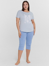 Набор одежды для дома и отдыха из трикотажного полотна.Футболка прямого кроя, горловина с обтачкой.Короткий цельнокроенный рукав,по плечу складки.Спереди и на плече принт,боковые разрезы.Сзади средний шов.Шорты с поясом на резинке,теромонаклейка силикон.