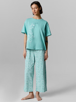 Пижама для дома и отдыха из трикотажного полотна кашкорсе. Футболка прямого кроя, короткий втачной рукав, округлая горловина с обтачкой, принт. По горловине контрастный застил. Шорты прямые с внутренней резинкой. По низу футболки и шорт мелкий оверлок.