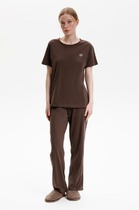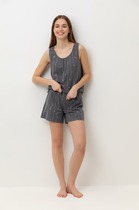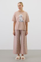 Пижама для дома из хлопкового трикотажного полотна. Футболка прямого силуэта, втачной короткий рукав. Округлая горловина с обтачкой. Спереди принт. Шорты свободные на поясе из жаккардовой резинки.
