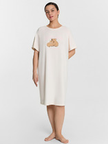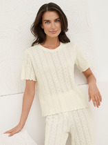 Пижама для дома из хлопкового трикотажного полотна. Майка на узких бретелях. По горловине переда обтачка с кружевом, бант.Отрезной лиф со сборкой. По пройме окантовка. По низу изделия мелкий оверлок. Короткие шорты с поясом на резинке. По низу шорт рюша.