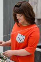 Платье-рубашка для дома и отдыха из хлопкового трикотажного полотна с карбоном, прямого силуэта. Втачной длинный рукав. Застёжка на пуговицы, воротник с лацканами. На детали переда накладной карман, нашивка. Низ изделия округлой формы, по бокам разрезы.