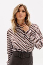 Блузка прямого силуэта из трикотажного полотна, с отложным воротником на стойке. Спереди цельнокроеная планка с застежкой на пуговицы. Длинный втачной рукав, внизу с притачной манжетой и застежкой на пуговицу. По спинке кокетка со складкой.