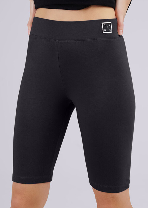 Облегающие шорты на высокой посадке длиной до колена. Широкий притачной пояс из основного материала.