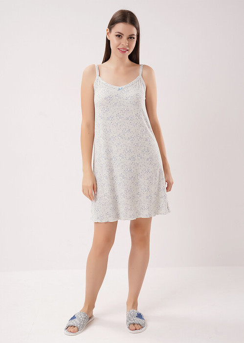 Ночная сорочка А-образного силуэта из вискозного трикотажного полотна кашкорсе. Длиной чуть ниже колена, на узких бретелях. По горловине и пройме окантовка. На детали переда бант. По низу изделия мелкий оверлок.