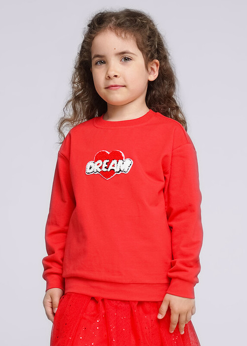 Яркий свитшот из футера для девочки с объемной фактурной нашивкой. Свободный фасон oversize. Рукава с немного спущенным плечом и манжетами, эластичная горловина из кашкорсе. Отлично сочетается с кожаной юбкой или шортами из коллекции.