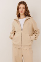 Куртка спортивная из трикотажного полотна футер,на молнии. По горловине капюшон на подкладе со шнуром. Длинный рукав со спущенной линией плеча, нашивка.По низу рукава и изделия манжеты. Спереди карман кенгуру, принт.По пройме и шву рукава открытый срез.