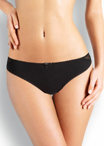 Бикини с кружевной вставкой по верху переда и кружевной спинкой со средним швом. По поясу и ножке со стороны переда обработка резинкой с фестоном. На детали переда - небольшой атласный бант.