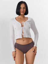 Трусы бразилиана выполнены из эластичного кружева с фестонами, декорирована бантиком из атласной ленты. Внутренняя ластовица выполнена из хлопкового полотна.