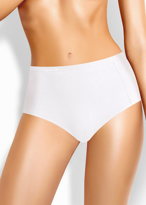Трусы макси на высокой посадке из интерлока, состав 80% хлопок, 20% эластан. Боковые швы смещены в сторону переда, по ножке бесшовная обработка, полотно не распускается за счет особенностей плетения, по талии обработка жаккардовой резинкой.