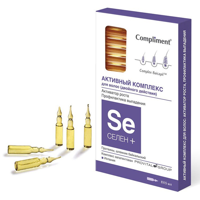 Ампульный комплекс Compliment Селен+ предназначен для роста волос, его биоактивные компоненты воздействуют на микроциркуляцию в сосудах кожи головы, значительно улучшая обменные процессы в волосяных луковицах и способствуя укреплению волос.
