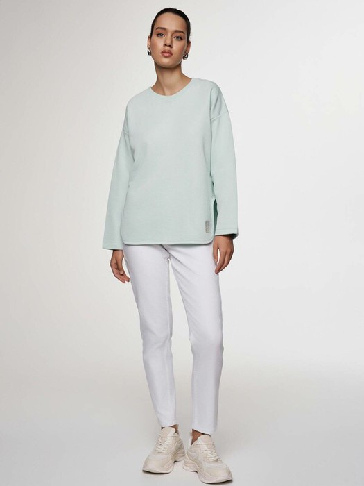 Лонгслив из футера c разрезами по бокам и аппликацией из стразов станет основой для множества расслабленных базовых образов.