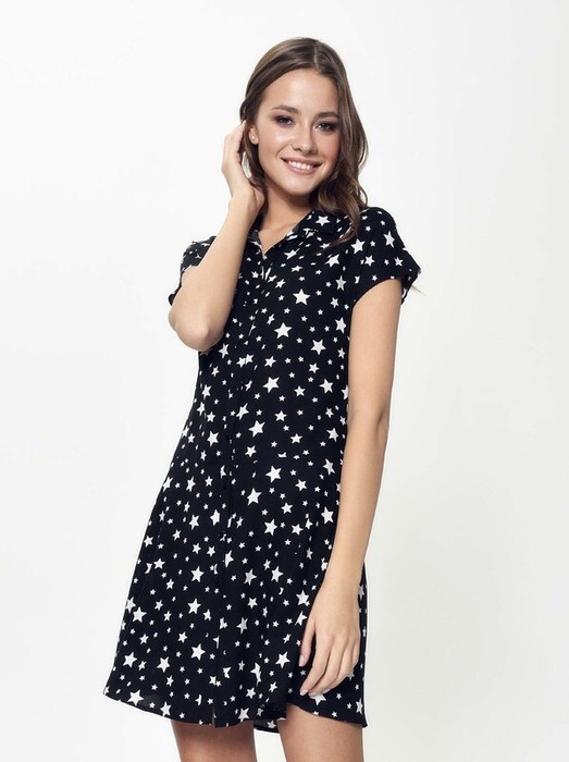 Ультрамодное платье-рубашка из легкого вискозного полотна с воротником и планкой на пуговицах станет вашей любимой вещью для долгих прогулок, шоппинга, свиданий и отдыха. Безупречная посадка по фигуре, длина мини, абсолютная свобода движений и яркий принт “звезды” – в этом платье вы будете неотразимы. Готовьтесь принимать комплименты!