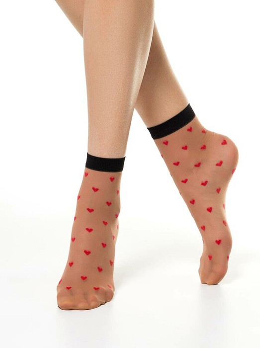 Тонкие фантазийные носки с рисунком «сердечки», выполненном из красной полипропиленовой нити – идеальное дополнение к романтичному образу современной девушки. Носки эластичные, легкие, безупречно облегающие ногу, поэтому в них будет комфортно на протяжении всего дня.