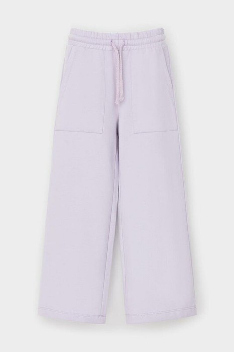 Прямые брюки для девочки из мягкого петельчатого трикотажа. Эластичный пояс на резинке регулируется по ширине с помощью шнурка. По бокам два удобных накладных кармана.