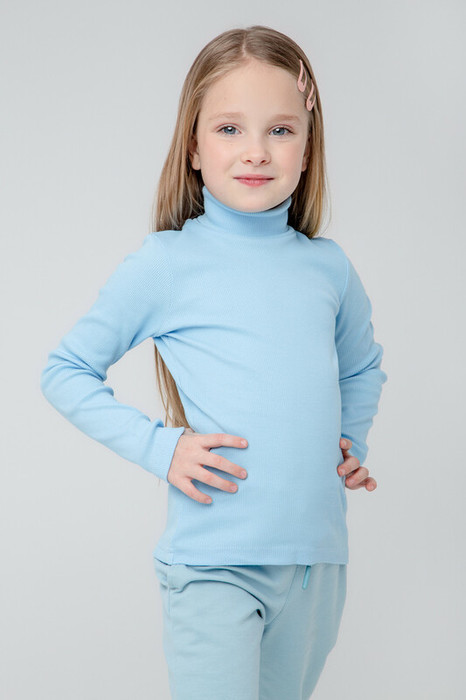 Однотонная детская водолазка из эластичного трикотажа кашкорсе. Длинные рукава. Высокая горловина с отворотом.