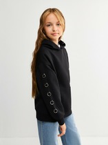 Толстовка с капюшоном и принтом для девочки из футера трехнитки с начесом.  Манжеты и пояс выполнены из эластичного полотна. Спереди удобный карман-кенгуру. Оригинальный принт выполнен из стойких текстильных красителей.
