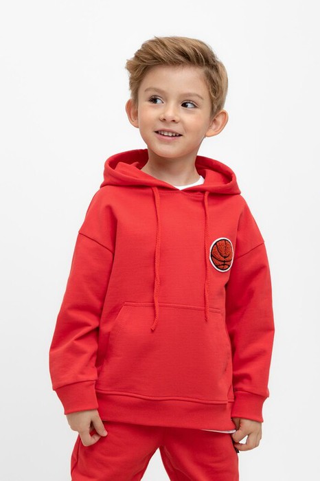 Худи с капюшоном для мальчика из петельчатого футера. Манжеты и пояс из эластичного трикотажа в рубчик. Спереди удобный карман-кенгуру.