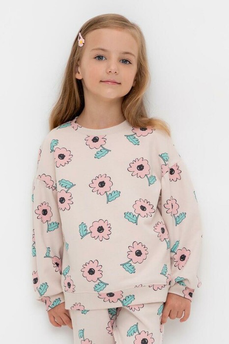 Свитшот для девочки из высококачественного петельчатого футера. Обтачка горловины, манжеты и пояс выполнены из эластичного полотна. Для удобства одевания на плече в размере 98 есть застежка на кнопки. Оригинальная набивка выполнена из стойких текстильных гипоаллергенных красителей.