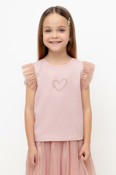 Нарядная футболка для девочки из высококачественного эластичного трикотажа с лёгкими рукавами из сетки с переливом. Оригинальный принт выполнен из стойких, гипоаллергенных текстильных красителей. Футболка сохраняет форму и стойкий цвет после многочисленных стирок и идеально подходит для праздников и фотосессий.