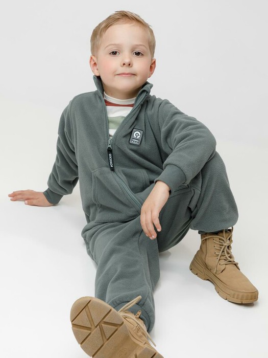 Флисовый комбинезон для мальчика с высоким воротником. Застёгивается на удлинённую молнию с мягкой защитой шеи и подбородка. Рукава и низ изделия на манжетах из  трикотажа в рубчик. Эластичная резинка по спинке обеспечивает идеальную посадку. Спереди удобный карман-кенгуру. Комбинезон сохраняет цвет и форму после многократных стирок.