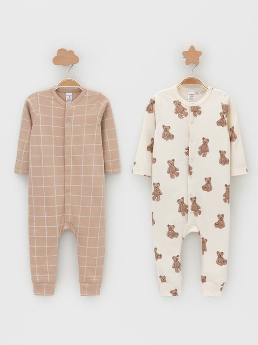 Комбинезоны для новорождённых из мягкого эластичного трикотажа, произведённого из натурального хлопка. В упаковке 2 штуки. Застёгиваются спереди на кнопки. Оригинальная набивка выполнена из стойких гипоаллергенных текстильных красителей. Все трикотажные полотна производятся в соответствии с нормами швейцарского сертификата ЭкоТекс.