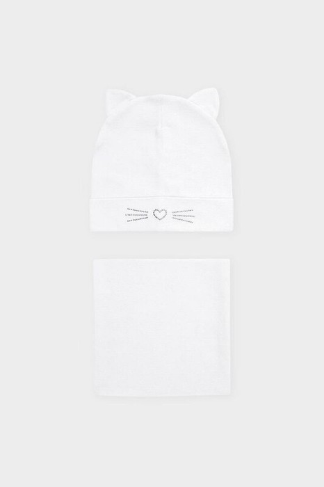 Комплект для девочки: шапка и снуд из хлопкового трикотажа с добавлением эластана, окрашенного стойкими гипоаллергенными текстильными красителями. Изделия хорошо тянутся, после многократных стирок сохраняют цвет и форму.