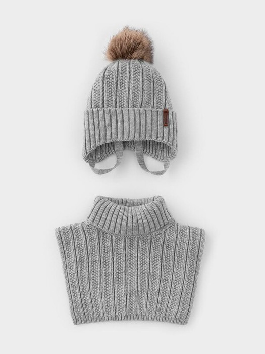 Комплект для мальчика: шапка и манишка из полушерстяной пряжи. Шапка на завязках с синтепоновым утеплителем. Подклад из натурального хлопка. Полностью закрывает голову, уши и шею, защищая ребёнка от холодного воздуха и ветра. На макушке помпон. Манишка с высоким воротником с эластичным отворотом.