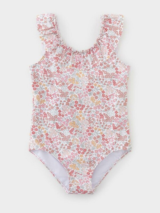 Слитный купальник на лямках для девочки. Украшен оборками. Внутри подклад. Оригинальная набивка выполнена из стойких гипоаллергенных красителей.