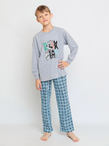 Пижама для мальчика из натурального хлопка. Джемпер с длинными втачными рукавами и брюки с эластичной резинкой в поясе. Мягкие манжеты по низу брюк сделаны из материала в рубчик. Оригинальная набивка и принт выполнены из стойких текстильных гипоаллергенных красителей. Изделие сохраняет цвет и форму после многократных стирок. Все трикотажные полотна производятся в соответствии с нормами швейцарского сертификата ЭкоТекс.