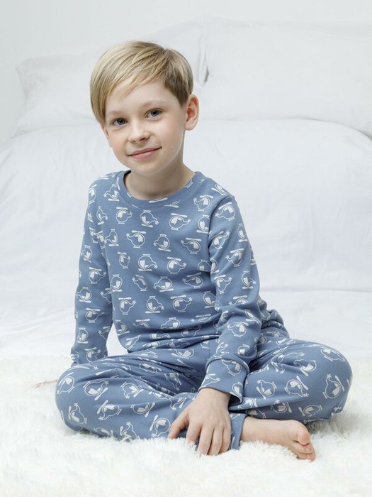 Трикотажная пижама из натурального хлопка. Джемпер с длинными втачными рукавами и брюки с эластичной резинкой в поясе. Мягкие манжеты на рукавах и по низу брюк. Оригинальная набивка выполнена из стойких текстильных гипоаллергенных красителей. Изделие сохраняет цвет и форму после многократных стирок. Все трикотажные полотна производятся в соответствии с нормами швейцарского сертификата ЭкоТекс.
