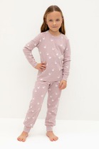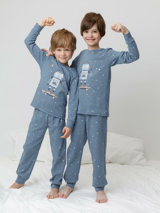 Трикотажная пижама из натурального хлопка. Джемпер с длинными втачными рукавами и брюки с эластичной резинкой в поясе. Мягкие манжеты на рукавах и по низу брюк. Оригинальная набивка и принт выполнены из стойких текстильных гипоаллергенных красителей. Изделие сохраняет цвет и форму после многократных стирок. Все трикотажные полотна производятся в соответсвии с нормами швейцарского сертификата ЭкоТекс.