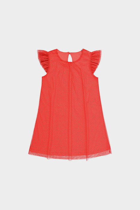 Нарядное платье для девочки из высококачественного трикотажа супрем с лёгким слоем из сетки с блёстками. Лиф украшен изящными крылышками из сетки. Для удобства одевания платье застёгивается на пуговицу на спинке. Платье сохраняет форму и стойкий цвет после многочисленных стирок и идеально подходит для праздников и фотосессий.