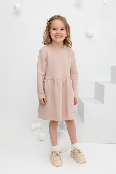 Трикотажное платье с длинными рукавами и накладными карманами из высококачественного петельчатого футера. В составе 80% натурального хлопка и 20% полиэстера, при этом полиэстер ввязан внутрь по особой технологии и не соприкасается с кожей.  Изделие сохраняет цвет и форму после многократных стирок.