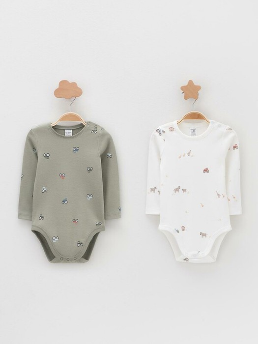Боди для новорождённых из мягкого эластичного трикотажа, произведённого из натурального хлопка. В упаковке 2 штуки. Застёгиваются на кнопки на плече и по низу изделий. Оригинальная набивка и принт выполнены из стойких гипоаллергенных текстильных красителей. Все трикотажные полотна производятся в соответствии с нормами швейцарского сертификата ЭкоТекс.