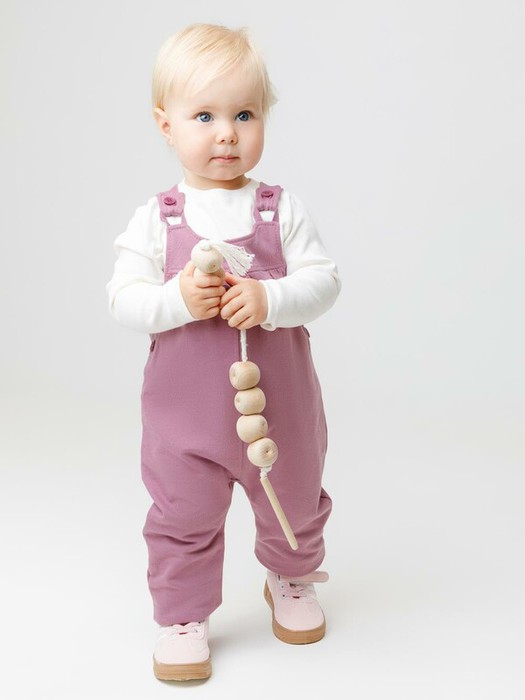 Полукомбинезон с лямками из мягкого петельчатого футера для девочки. Застёгивается на пуговицы. В размерах 74 и 80 предусмотрена пошаговая застёжка на кнопки. Низ на манжетах. Изделие сохраняет цвет и форму после многократных стирок. Все трикотажные полотна производятся в соответствии с нормами швейцарского сертификата ЭкоТекс.