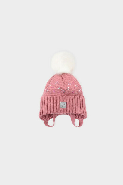 Шапка на широких завязках с высоким отворотом и мягким подкладом из интерлока. Спереди украшена стразами. На отвороте прикреплён светоотражатель, который обеспечивает дополнительную безопасность в тёмное время суток. На макушке - меховой помпон.