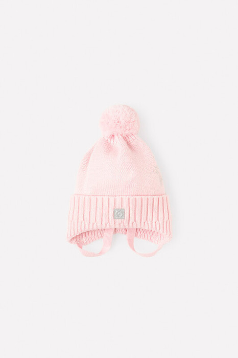 Светло-розовая шапка из полушерсти на завязках. Внутри - мягкая подкладка из трикотажа интерлок. Украшена вязаным помпоном на макушке и блестящими стразами. Для безопасности в тёмное время суток на передней части шапочки прикреплён светоотражатель.