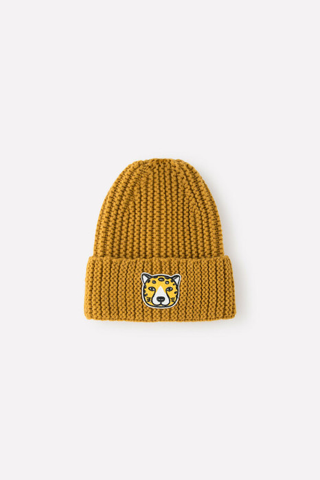 Модная детская шапка с широким отворотом. Связана из полушерстяной пряжи в оттенке "горчица". Украшена нашивкой с изображением мордочки леопарда.