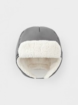 Зимняя шапка детская из однотонной мембранной ткани. Внутри искусственный утеплитель и подклад из мягкого длинноворсового флиса. Застёгивается под подбородком на липучку. Спереди отворот на липучке. На затылке эластичная резинка. Сбоку прикреплён светоотражатель.