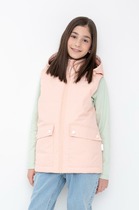 Стеганый жилет с капюшоном для девочки с утеплителем Fellex®: 120 г/м2. Выполнен из мембранной ткани с дополнительной тефлоновой обработкой. Данный вид обработки предохраняет изделие от загрязнения и лучше отводит влагу. Подклад из 100% полиэстра. У изделия предусмотрена защита подбородка. Капюшон утягивается при помощи эластичного шнура со стопперами. Накладные карманы с клапанами на кнопках. Во всех изделиях верхнего ассортимента для безопасности ребенка предусмотрены светоотражающие элементы.